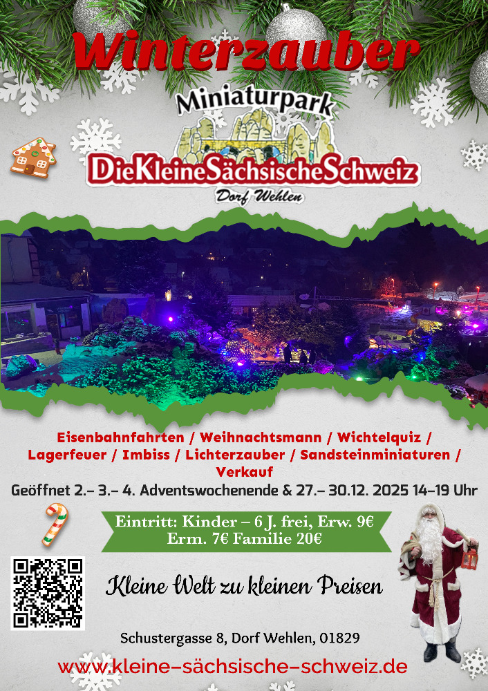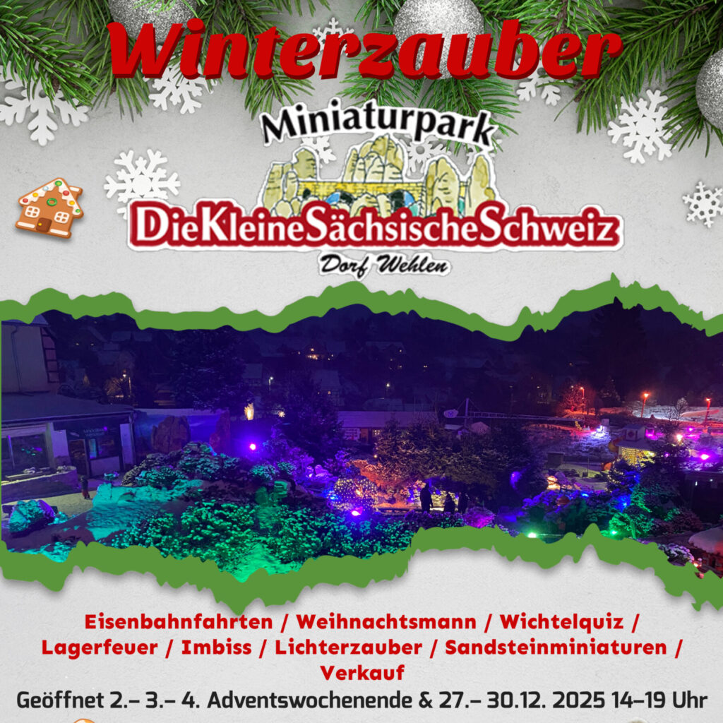 Jetzt können wir Sie auch in der dunklen Jahreszeit herzlich willkommen heißen in der zauberhaft weihnachtlich geschmückten Miniaturlandschaft aus echtem Sandstein.
